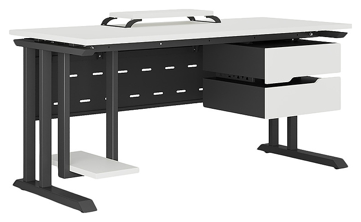 Офисный стол Кобор L1-180/80 black/premium используется в офисных помещениях и кабинетах руководителей. Модель оснащена L-образными опорами. Каркас выполнен из металла, выкрашенного в цвет черный муар (RAL9005), столешница – из ламинированной древесно-стружечной плиты (ЛДСП) цвета белый премиум (W1000 S9). Опции (заказываются отдельно):