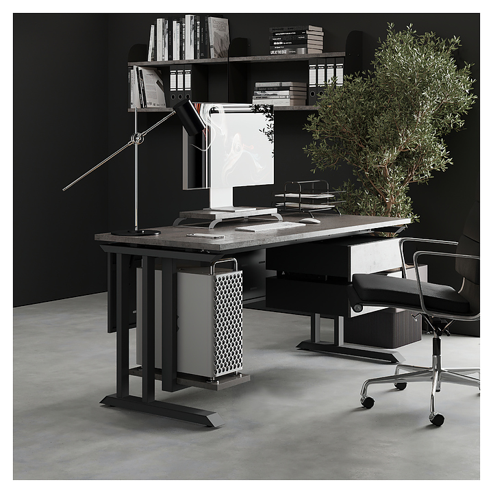 Офисный стол Кобор L1-100/70 black/chicago используется в офисных помещениях и кабинетах руководителей. Модель оснащена L-образными опорами. Каркас выполнен из металла, выкрашенного в цвет черный муар (RAL9005), столешница – из ламинированной древесно-стружечной плиты (ЛДСП) цвета бетон чикаго (F186 ST9). Опции (заказываются отдельно):