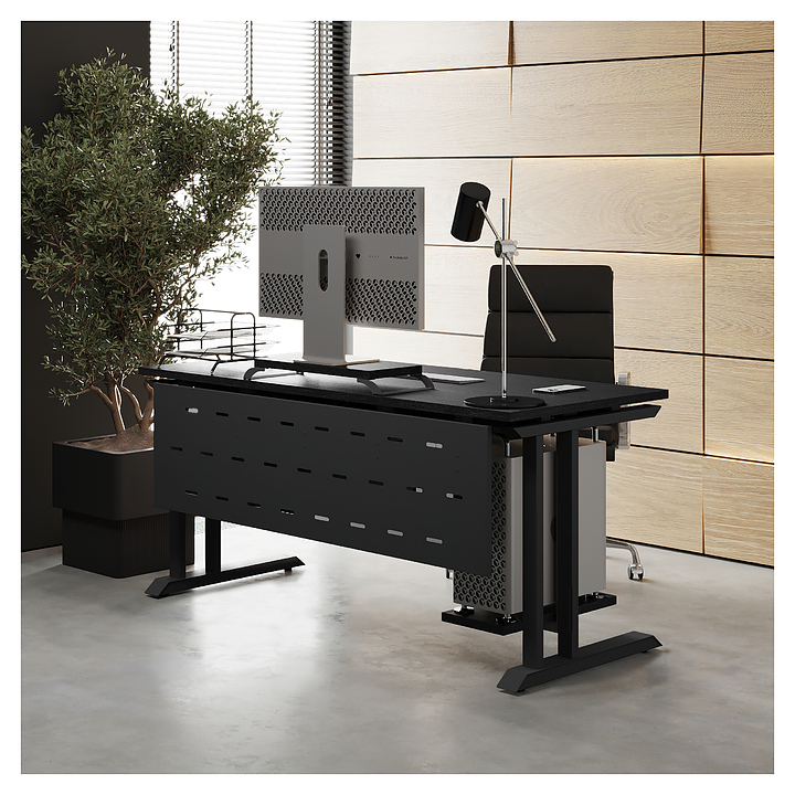 Офисный стол Кобор L1-80/80 black/glazed используется в офисных помещениях и кабинетах руководителей. Модель оснащена L-образными опорами. Каркас выполнен из металла, выкрашенного в цвет черный муар (RAL9005), столешница – из ламинированной древесно-стружечной плиты (ЛДСП) цвета черный дуб (H3178 ST37). Опции (заказываются отдельно):