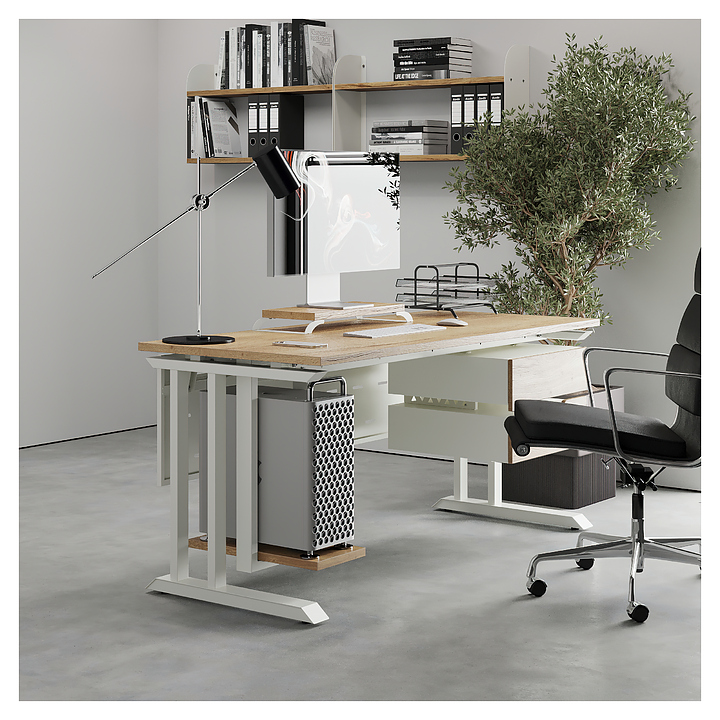 Офисный стол Кобор L1-140/60 white/natural используется в офисных помещениях и кабинетах руководителей. Модель оснащена L-образными опорами. Каркас выполнен из металла, выкрашенного в цвет белый муар (RAL9016), столешница – из ламинированной древесно-стружечной плиты (ЛДСП) цвета натуральный дуб (H1180 ST37). Опции (заказываются отдельно):