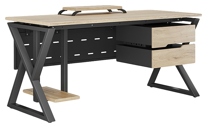 Офисный стол Кобор W-80/70 black/natural используется в офисных помещениях и кабинетах руководителей. Модель оснащена W-образными опорами. Каркас выполнен из металла, выкрашенного в цвет черный муар (RAL9005), столешница – из ламинированной древесно-стружечной плиты (ЛДСП) цвета натуральный дуб (H1180 ST37). Опции (заказываются отдельно):