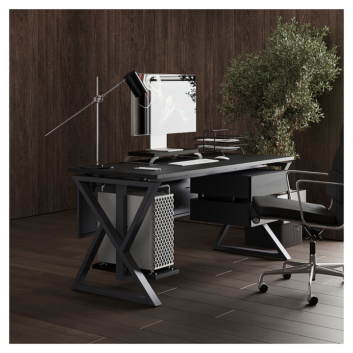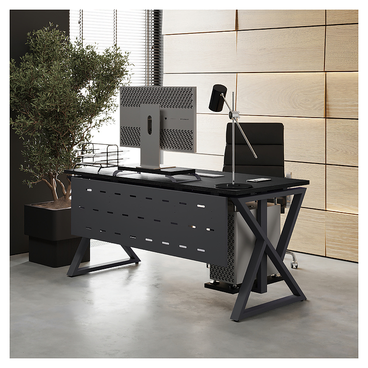 Офисный стол Кобор W-100/80 graphite/glazed используется в офисных помещениях и кабинетах руководителей. Модель оснащена W-образными опорами. Каркас выполнен из металла, выкрашенного в цвет графит муар (RAL7024), столешница – из ламинированной древесно-стружечной плиты (ЛДСП) цвета черный дуб (H3178 ST37). Опции (заказываются отдельно):
