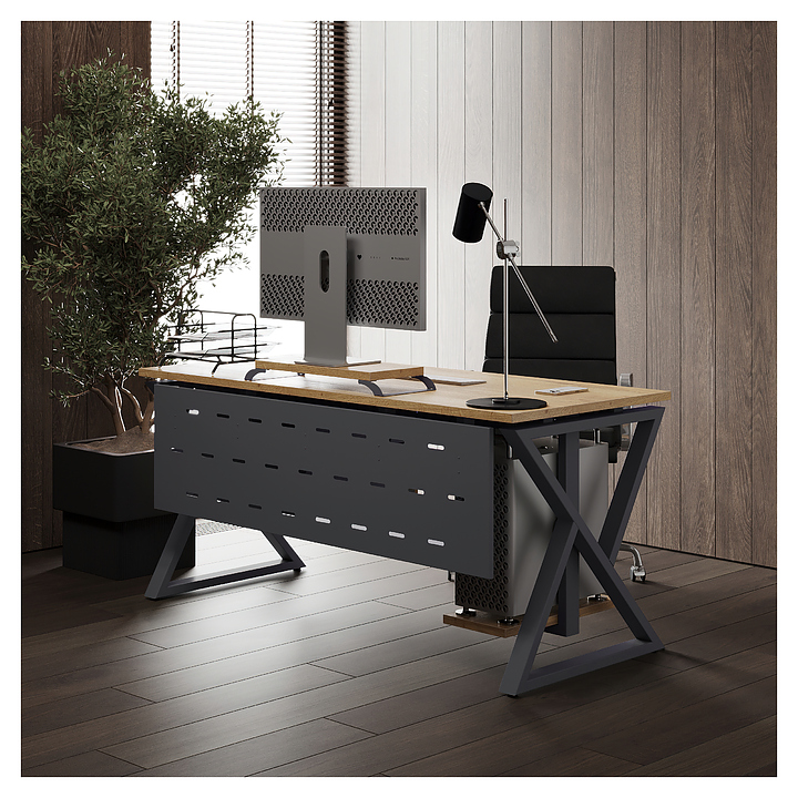 Офисный стол Кобор W-80/80 graphite/natural используется в офисных помещениях и кабинетах руководителей. Модель оснащена W-образными опорами. Каркас выполнен из металла, выкрашенного в цвет графит муар (RAL7024), столешница – из ламинированной древесно-стружечной плиты (ЛДСП) цвета натуральный дуб (H1180 ST37). Опции (заказываются отдельно):