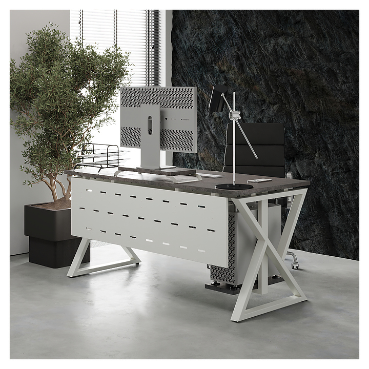 Офисный стол Кобор W-180/60 white/chicago используется в офисных помещениях и кабинетах руководителей. Модель оснащена W-образными опорами. Каркас выполнен из металла, выкрашенного в цвет белый муар (RAL9016), столешница – из ламинированной древесно-стружечной плиты (ЛДСП) цвета бетон чикаго (F186 ST9). Опции (заказываются отдельно):
