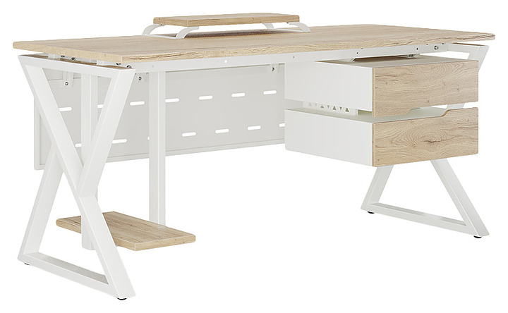 Офисный стол Кобор W-180/60 white/natural используется в офисных помещениях и кабинетах руководителей. Модель оснащена W-образными опорами. Каркас выполнен из металла, выкрашенного в цвет белый муар (RAL9016), столешница – из ламинированной древесно-стружечной плиты (ЛДСП) цвета натуральный дуб (H1180 ST37). Опции (заказываются отдельно):