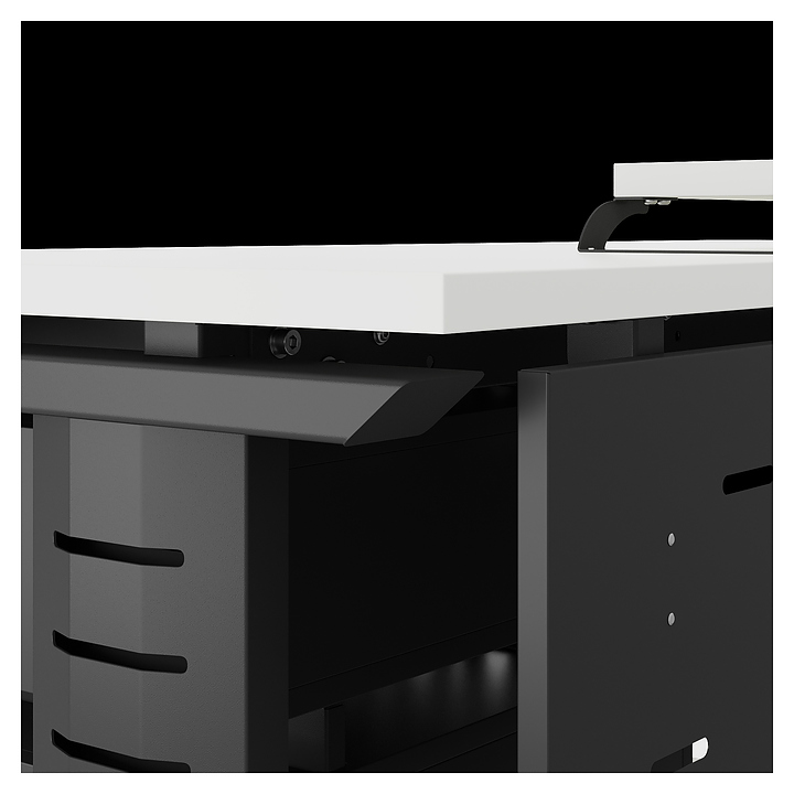 Офисный стол Кобор L2-180/70 black/premium используется в офисных помещениях и кабинетах руководителей. Модель оснащена L-образными опорами с декоративной вставкой на боковинах. Каркас выполнен из металла, выкрашенного в цвет черный муар (RAL9005), столешница – из ламинированной древесно-стружечной плиты (ЛДСП) цвета белый премиум (W1000 S9). Опции (заказываются отдельно):