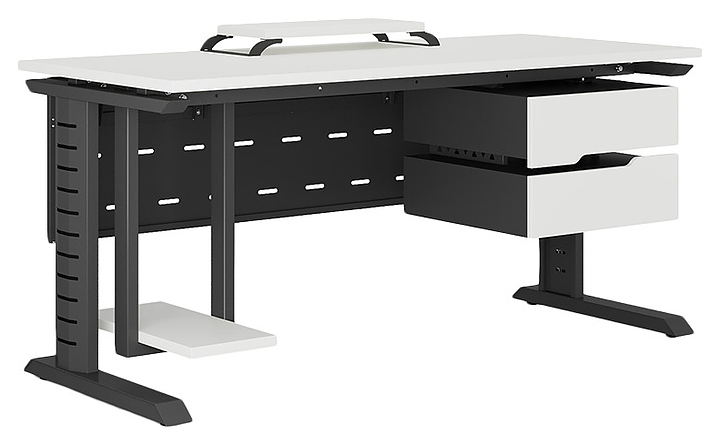 Офисный стол Кобор L2-140/80 black/premium используется в офисных помещениях и кабинетах руководителей. Модель оснащена L-образными опорами с декоративной вставкой на боковинах. Каркас выполнен из металла, выкрашенного в цвет черный муар (RAL9005), столешница – из ламинированной древесно-стружечной плиты (ЛДСП) цвета белый премиум (W1000 S9). Опции (заказываются отдельно):