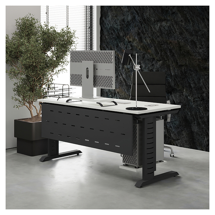 Офисный стол Кобор L2-180/80 black/premium используется в офисных помещениях и кабинетах руководителей. Модель оснащена L-образными опорами с декоративной вставкой на боковинах. Каркас выполнен из металла, выкрашенного в цвет черный муар (RAL9005), столешница – из ламинированной древесно-стружечной плиты (ЛДСП) цвета белый премиум (W1000 S9). Опции (заказываются отдельно):