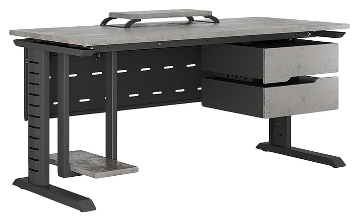 Офисный стол Кобор L2-80/80 black/chicago используется в офисных помещениях и кабинетах руководителей. Модель оснащена L-образными опорами с декоративной вставкой на боковинах. Каркас выполнен из металла, выкрашенного в цвет черный муар (RAL9005), столешница – из ламинированной древесно-стружечной плиты (ЛДСП) цвета бетон чикаго (F186 ST9). Опции (заказываются отдельно):