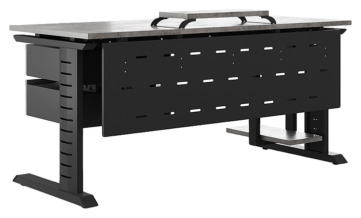 Офисный стол Кобор L2-120/80 black/chicago используется в офисных помещениях и кабинетах руководителей. Модель оснащена L-образными опорами с декоративной вставкой на боковинах. Каркас выполнен из металла, выкрашенного в цвет черный муар (RAL9005), столешница – из ламинированной древесно-стружечной плиты (ЛДСП) цвета бетон чикаго (F186 ST9). Опции (заказываются отдельно):