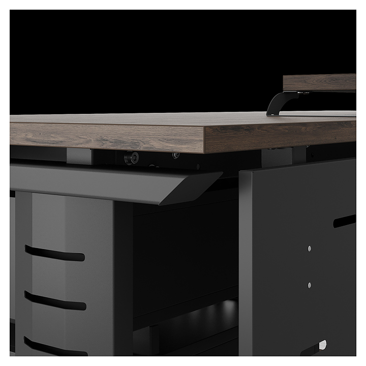 Офисный стол Кобор L2-140/80 black/charlston используется в офисных помещениях и кабинетах руководителей. Модель оснащена L-образными опорами с декоративными вставками на боковинах. Каркас выполнен из металла, выкрашенного в цвет черный муар (RAL9005), столешница – из ламинированной древесно-стружечной плиты (ЛДСП) цвета дуб чарльстон (H3154 ST36). Опции (заказываются отдельно):