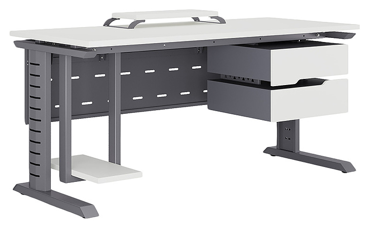 Офисный стол Кобор L2-100/60 graphite/premium используется в офисных помещениях и кабинетах руководителей. Модель оснащена L-образными опорами с декоративными вставками на боковинах. Каркас выполнен из металла, выкрашенного в цвет графит муар (RAL7024), столешница – из ламинированной древесно-стружечной плиты (ЛДСП) цвета белый премиум (W1000 ST9). Опции (заказываются отдельно):