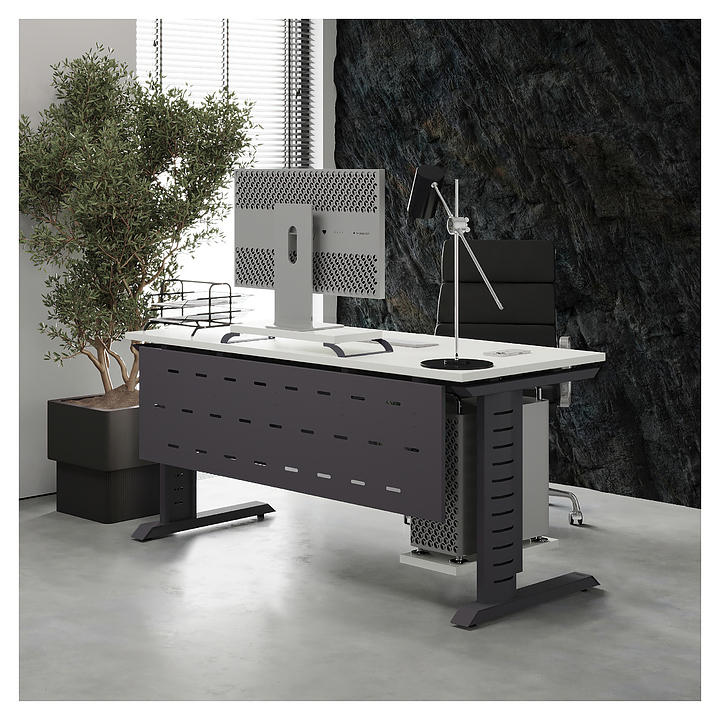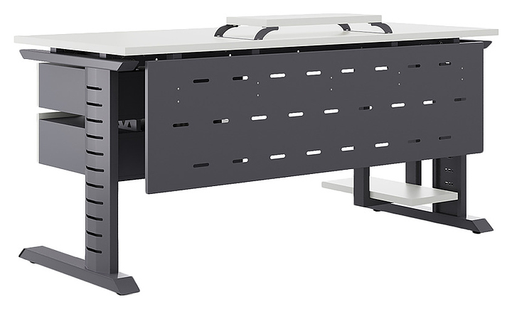 Офисный стол Кобор L2-120/60 graphite/premium используется в офисных помещениях и кабинетах руководителей. Модель оснащена L-образными опорами с декоративными вставками на боковинах. Каркас выполнен из металла, выкрашенного в цвет графит муар (RAL7024), столешница – из ламинированной древесно-стружечной плиты (ЛДСП) цвета белый премиум (W1000 ST9). Опции (заказываются отдельно):