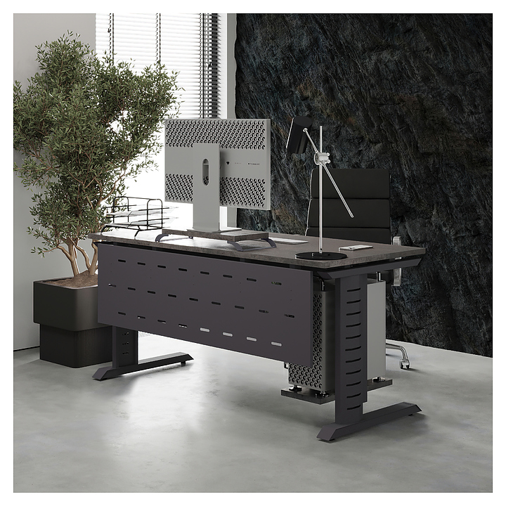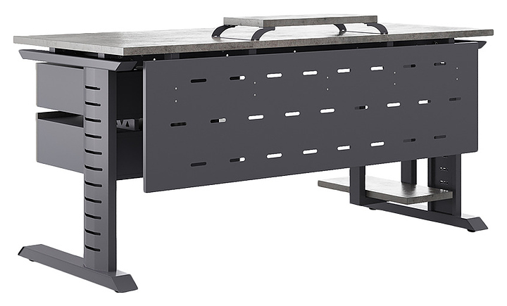 Офисный стол Кобор L2-180/70 graphite/chicago используется в офисных помещениях и кабинетах руководителей. Модель оснащена L-образными опорами с декоративными вставками на боковинах. Каркас выполнен из металла, выкрашенного в цвет графит муар (RAL7024), столешница – из ламинированной древесно-стружечной плиты (ЛДСП) цвета бетон чикаго (F186 ST9). Опции (заказываются отдельно):