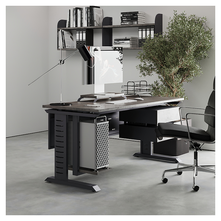 Офисный стол Кобор L2-160/80 graphite/chicago используется в офисных помещениях и кабинетах руководителей. Модель оснащена L-образными опорами с декоративными вставками на боковинах. Каркас выполнен из металла, выкрашенного в цвет графит муар (RAL7024), столешница – из ламинированной древесно-стружечной плиты (ЛДСП) цвета бетон чикаго (F186 ST9). Опции (заказываются отдельно):