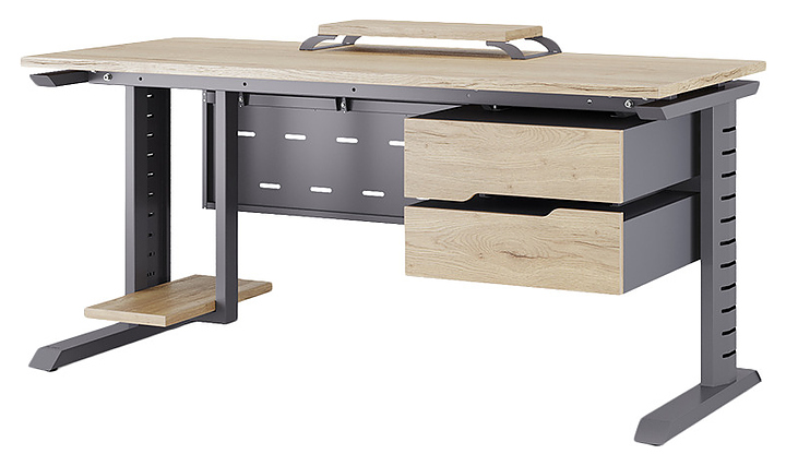 Офисный стол Кобор L2-140/60 graphite/natural используется в офисных помещениях и кабинетах руководителей. Модель оснащена L-образными опорами с декоративными вставками на боковинах. Каркас выполнен из металла, выкрашенного в цвет графит муар (RAL7024), столешница – из ламинированной древесно-стружечной плиты (ЛДСП) цвета натуральный дуб (H1180 ST37). Опции (заказываются отдельно):