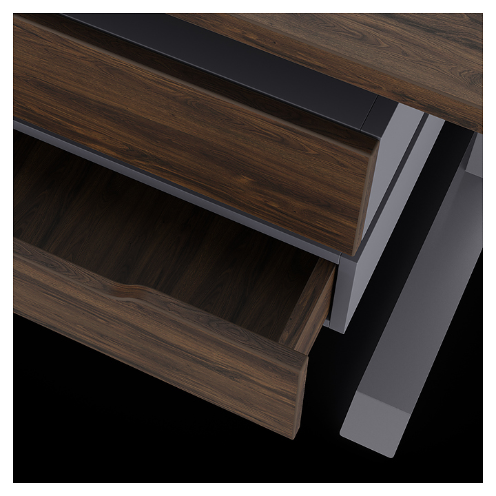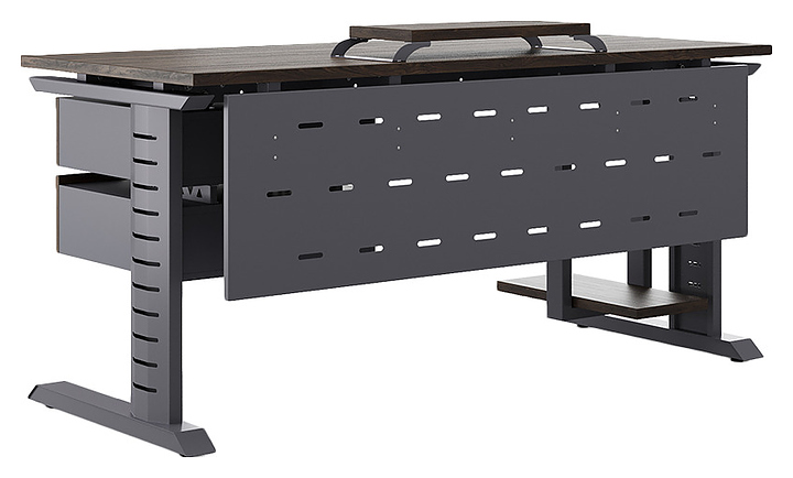 Офисный стол Кобор L2-180/70 graphite/charlston используется в офисных помещениях и кабинетах руководителей. Модель оснащена L-образными опорами с декоративными вставками на боковинах. Каркас выполнен из металла, выкрашенного в цвет графит муар (RAL7024), столешница – из ламинированной древесно-стружечной плиты (ЛДСП) цвета дуб чарльстон (H3154 ST36). Опции (заказываются отдельно):