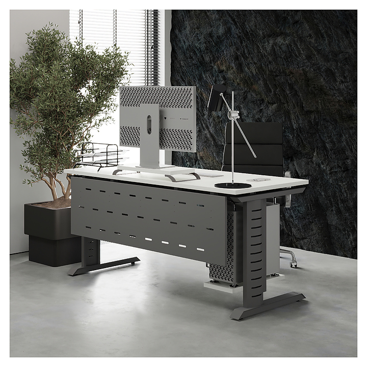 Офисный стол Кобор L2-180/80 aluminum/premium используется в офисных помещениях и кабинетах руководителей. Модель оснащена L-образными опорами с декоративными вставками на боковинах. Каркас выполнен из металла, выкрашенного в цвет алюминиевый металлик (RAL9006), столешница – из ламинированной древесно-стружечной плиты (ЛДСП) цвета белый премиум (W1000 ST9). Опции (заказываются отдельно):