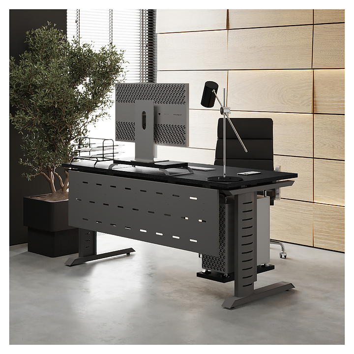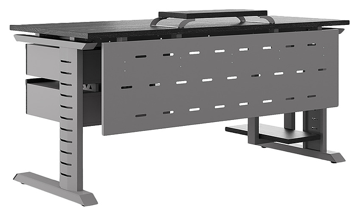 Офисный стол Кобор L2-120/80 aluminum/glazed используется в офисных помещениях и кабинетах руководителей. Модель оснащена L-образными опорами с декоративными вставками на боковинах. Каркас выполнен из металла, выкрашенного в цвет алюминиевый металлик (RAL9006), столешница – из ламинированной древесно-стружечной плиты (ЛДСП) цвета черный дуб (H3178 ST37). Опции (заказываются отдельно):