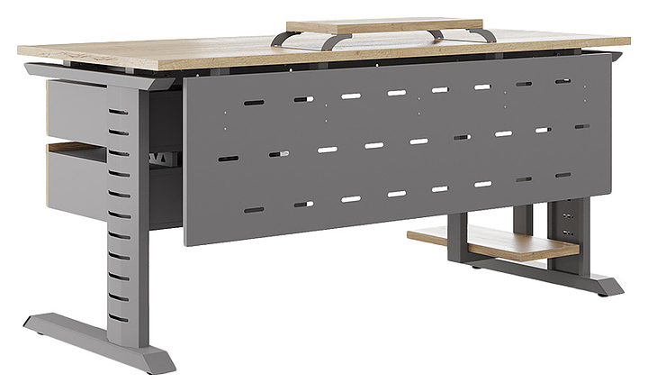 Офисный стол Кобор L2-100/70 aluminum/natural используется в офисных помещениях и кабинетах руководителей. Модель оснащена L-образными опорами с декоративными вставками на боковинах. Каркас выполнен из металла, выкрашенного в цвет алюминиевый металлик (RAL9006), столешница – из ламинированной древесно-стружечной плиты (ЛДСП) цвета натуральный дуб (H1180 ST37). Опции (заказываются отдельно):