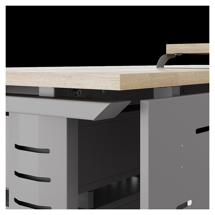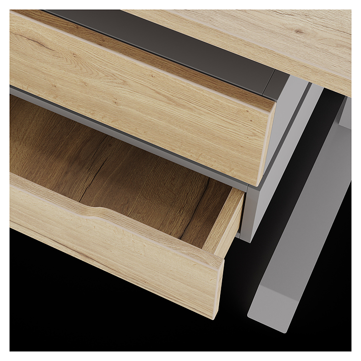 Офисный стол Кобор L2-180/80 aluminum/natural используется в офисных помещениях и кабинетах руководителей. Модель оснащена L-образными опорами с декоративными вставками на боковинах. Каркас выполнен из металла, выкрашенного в цвет алюминиевый металлик (RAL9006), столешница – из ламинированной древесно-стружечной плиты (ЛДСП) цвета натуральный дуб (H1180 ST37). Опции (заказываются отдельно):