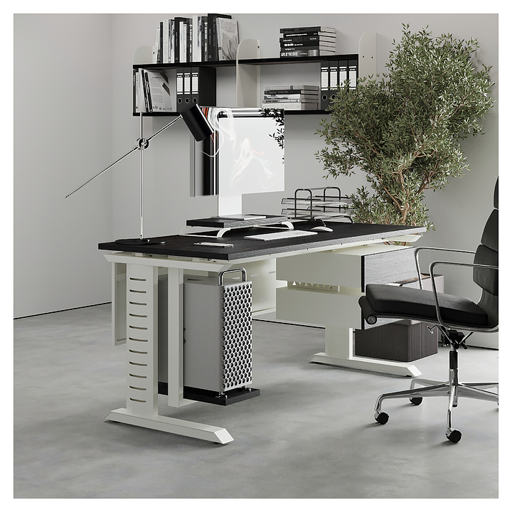 Офисный стол Кобор L2-120/60 white/glazed используется в офисных помещениях и кабинетах руководителей. Модель оснащена L-образными опорами с декоративными вставками на боковинах. Каркас выполнен из металла, выкрашенного в цвет белый муар (RAL9016), столешница – из ламинированной древесно-стружечной плиты (ЛДСП) цвета черный дуб (H3178 ST37). Опции (заказываются отдельно):