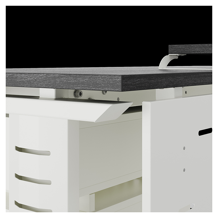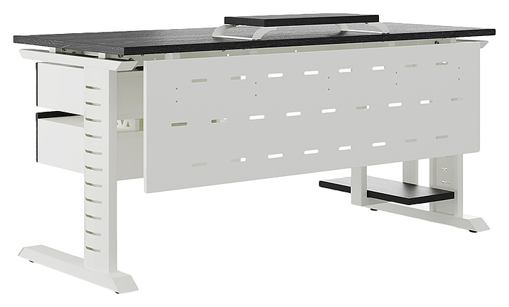 Офисный стол Кобор L2-80/80 white/glazed используется в офисных помещениях и кабинетах руководителей. Модель оснащена L-образными опорами с декоративными вставками на боковинах. Каркас выполнен из металла, выкрашенного в цвет белый муар (RAL9016), столешница – из ламинированной древесно-стружечной плиты (ЛДСП) цвета черный дуб (H3178 ST37). Опции (заказываются отдельно):