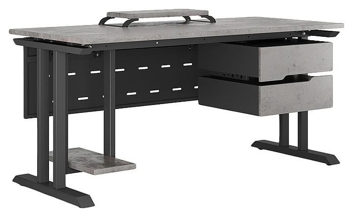 Офисный стол Кобор T-100/70 black/chicago используется в офисных помещениях и кабинетах руководителей. Модель оснащена T-образными опорами. Каркас выполнен из металла, выкрашенного в цвет черный муар (RAL9005), столешница – из ламинированной древесно-стружечной плиты (ЛДСП) цвета бетон чикаго (F186 ST9). Опции (заказываются отдельно):