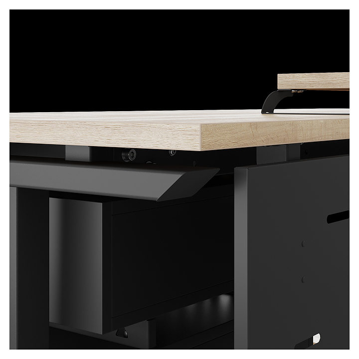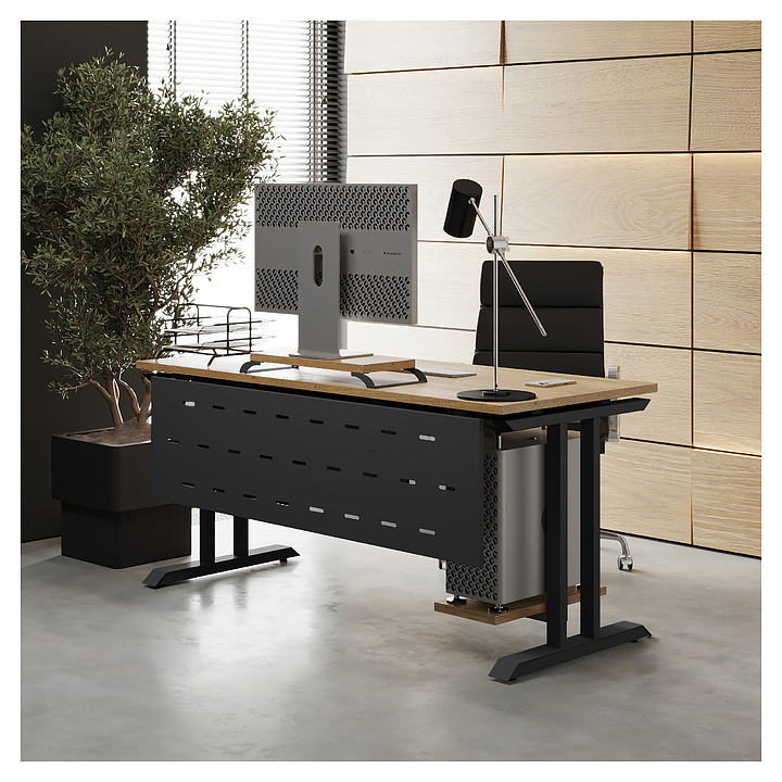 Офисный стол Кобор T-100/60 black/natural используется в офисных помещениях и кабинетах руководителей. Модель оснащена T-образными опорами. Каркас выполнен из металла, выкрашенного в цвет черный муар (RAL9005), столешница – из ламинированной древесно-стружечной плиты (ЛДСП) цвета натуральный дуб (H1180 ST37). Опции (заказываются отдельно):