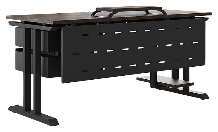 Офисный стол Кобор T-140/60 black/charlston используется в офисных помещениях и кабинетах руководителей. Модель оснащена T-образными опорами. Каркас выполнен из металла, выкрашенного в цвет черный муар (RAL9005), столешница – из ламинированной древесно-стружечной плиты (ЛДСП) цвета дуб чарльстон (H3154 ST36). Опции (заказываются отдельно):