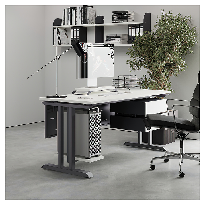 Офисный стол Кобор T-120/60 graphite/premium используется в офисных помещениях и кабинетах руководителей. Модель оснащена T-образными опорами. Каркас выполнен из металла, выкрашенного в цвет графит муар (RAL7024), столешница – из ламинированной древесно-стружечной плиты (ЛДСП) цвета белый премиум (W1000 ST9). Опции (заказываются отдельно):