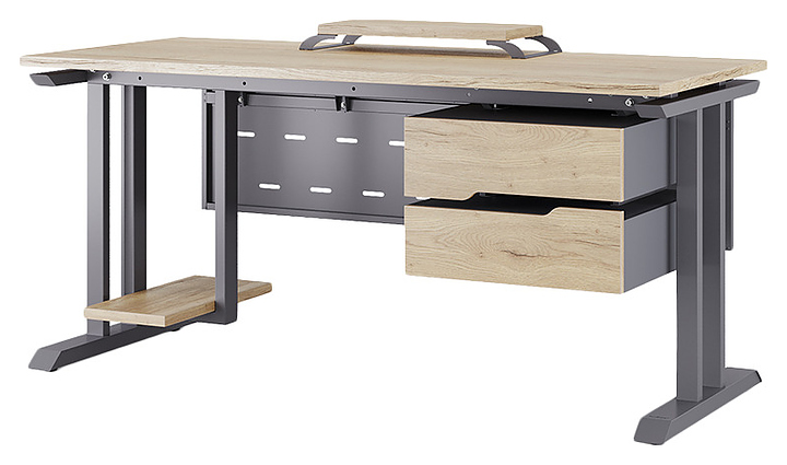 Офисный стол Кобор T-160/70 graphite/natural используется в офисных помещениях и кабинетах руководителей. Модель оснащена T-образными опорами. Каркас выполнен из металла, выкрашенного в цвет графит муар (RAL7024), столешница – из ламинированной древесно-стружечной плиты (ЛДСП) цвета натуральный дуб (H1180 ST37). Опции (заказываются отдельно):