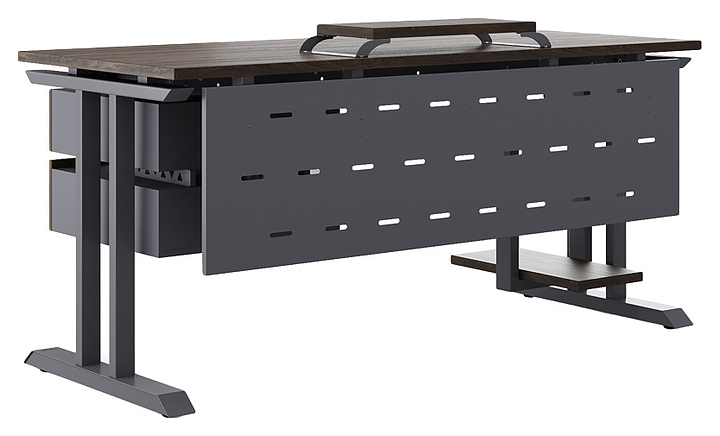 Офисный стол Кобор T-120/70 graphite/charlston используется в офисных помещениях и кабинетах руководителей. Модель оснащена T-образными опорами. Каркас выполнен из металла, выкрашенного в цвет графит муар (RAL7024), столешница – из ламинированной древесно-стружечной плиты (ЛДСП) цвета дуб чарльстон (H3154 ST36). Опции (заказываются отдельно):