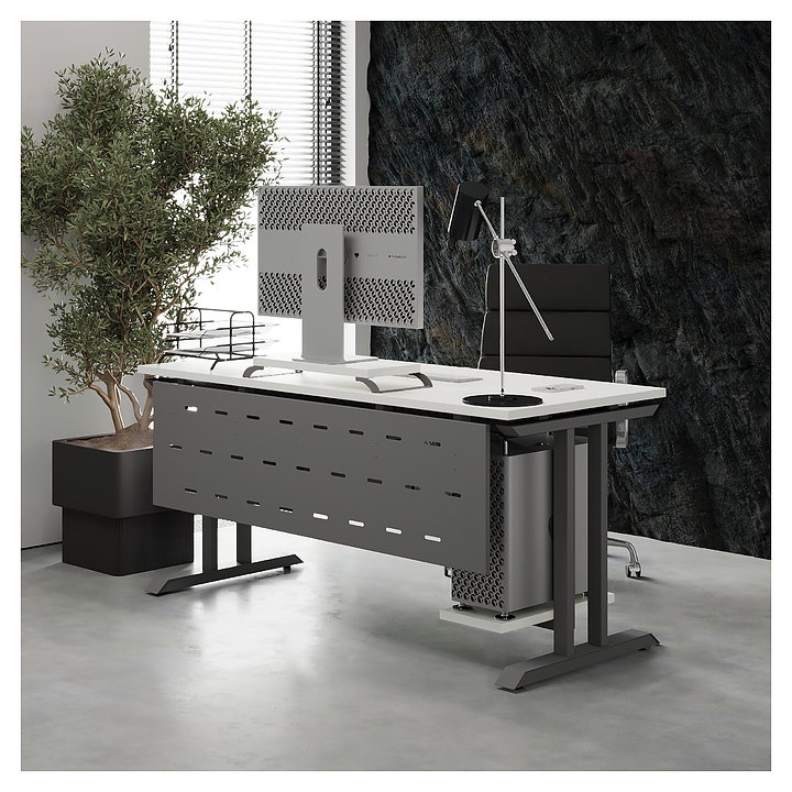 Офисный стол Кобор T-80/80 aluminum/premium используется в офисных помещениях и кабинетах руководителей. Модель оснащена T-образными опорами. Каркас выполнен из металла, выкрашенного в цвет алюминиевый металлик (RAL9006), столешница – из ламинированной древесно-стружечной плиты (ЛДСП) цвета белый премиум (W1000 ST9). Опции (заказываются отдельно):