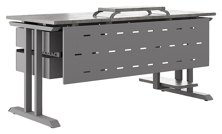 Офисный стол Кобор T-180/80 aluminum/chicago используется в офисных помещениях и кабинетах руководителей. Модель оснащена T-образными опорами. Каркас выполнен из металла, выкрашенного в цвет алюминиевый металлик (RAL9006), столешница – из ламинированной древесно-стружечной плиты (ЛДСП) цвета бетон чикаго (F186 ST9). Опции (заказываются отдельно):