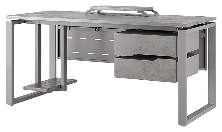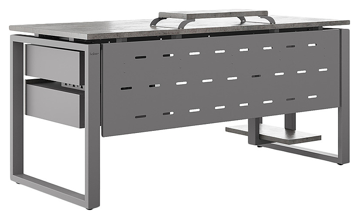 Офисный стол Кобор O1-180/80 aluminum/chicago используется в офисных помещениях и кабинетах руководителей. Модель оснащена O-образными опорами. Каркас выполнен из металла, выкрашенного в цвет алюминиевый металлик (RAL9006), столешница – из ламинированной древесно-стружечной плиты (ЛДСП) цвета бетон чикаго (F186 ST9). Опции (заказываются отдельно):