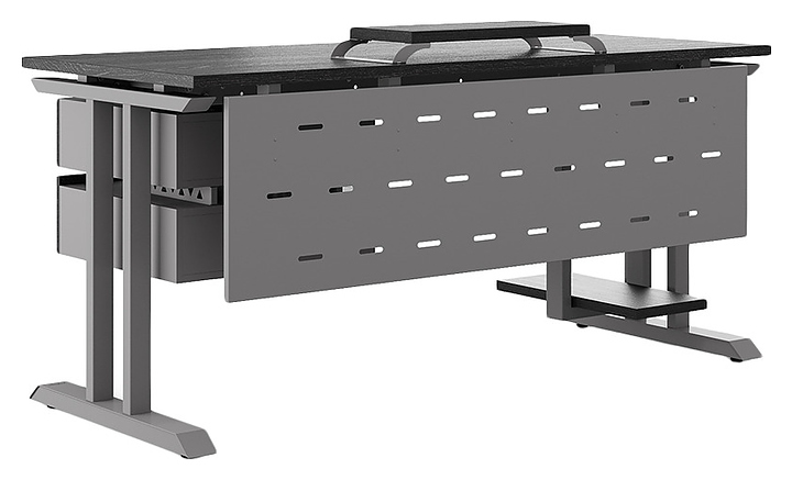 Офисный стол Кобор T-120/60 aluminum/glazed используется в офисных помещениях и кабинетах руководителей. Модель оснащена T-образными опорами. Каркас выполнен из металла, выкрашенного в цвет алюминиевый металлик (RAL9006), столешница – из ламинированной древесно-стружечной плиты (ЛДСП) цвета черный дуб (H3178 ST37). Опции (заказываются отдельно):