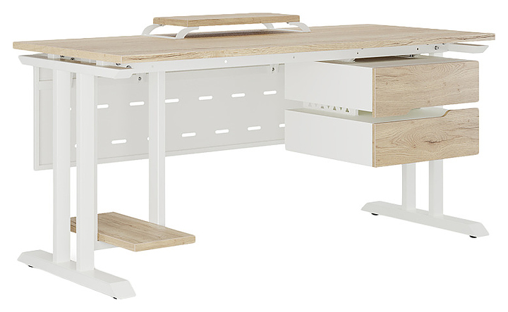 Офисный стол Кобор T-100/60 white/natural используется в офисных помещениях и кабинетах руководителей. Модель оснащена T-образными опорами. Каркас выполнен из металла, выкрашенного в цвет белый муар (RAL9016), столешница – из ламинированной древесно-стружечной плиты (ЛДСП) цвета натуральный дуб (H1180 ST37). Опции (заказываются отдельно):