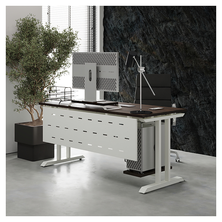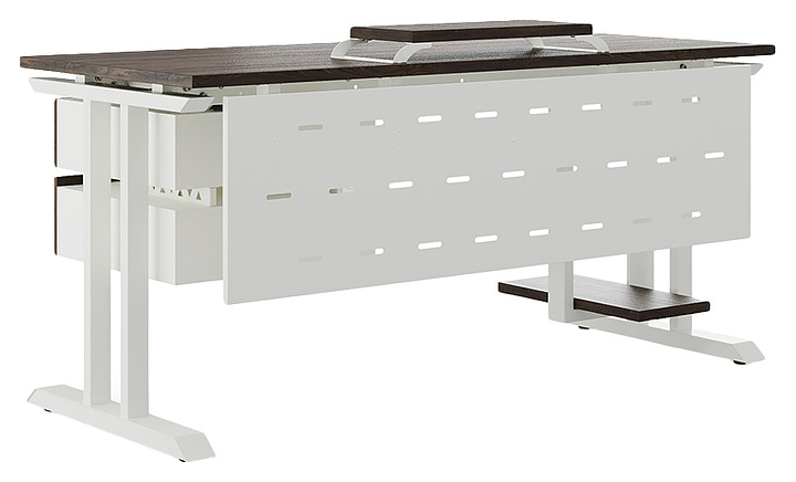 Офисный стол Кобор T-140/60 white/charlston используется в офисных помещениях и кабинетах руководителей. Модель оснащена T-образными опорами. Каркас выполнен из металла, выкрашенного в цвет белый муар (RAL9016), столешница – из ламинированной древесно-стружечной плиты (ЛДСП) цвета дуб чарльстон (H3154 ST36). Опции (заказываются отдельно):