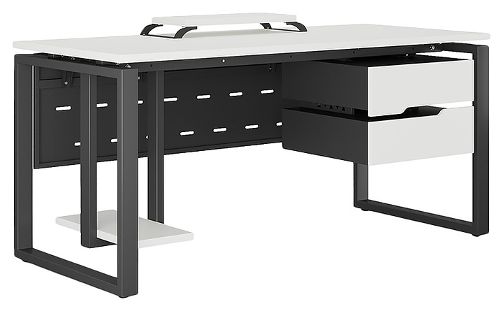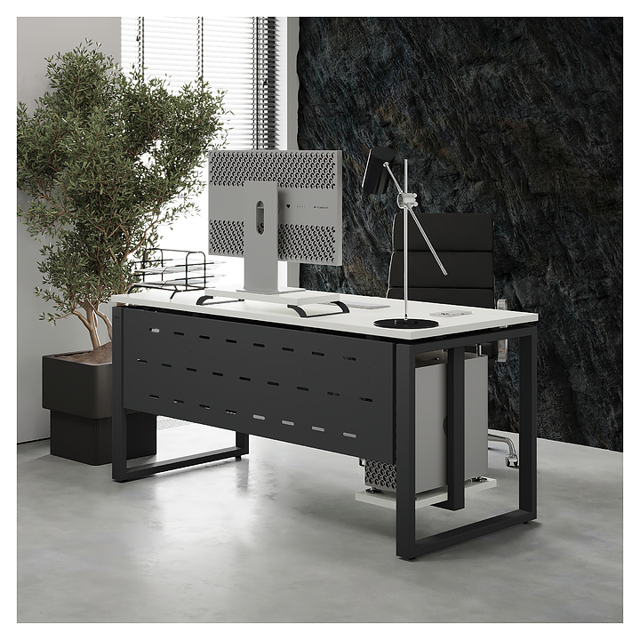 Офисный стол Кобор O1-80/80 black/premium используется в офисных помещениях и кабинетах руководителей. Модель оснащена O-образными опорами. Каркас выполнен из металла, выкрашенного в цвет черный муар (RAL9005), столешница – из ламинированной древесно-стружечной плиты (ЛДСП) цвета белый премиум (W1000 S9). Опции (заказываются отдельно):
