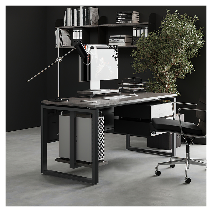 Офисный стол Кобор O1-140/70 black/chicago используется в офисных помещениях и кабинетах руководителей. Модель оснащена O-образными опорами. Каркас выполнен из металла, выкрашенного в цвет черный муар (RAL9005), столешница – из ламинированной древесно-стружечной плиты (ЛДСП) цвета бетон чикаго (F186 ST9). Опции (заказываются отдельно):
