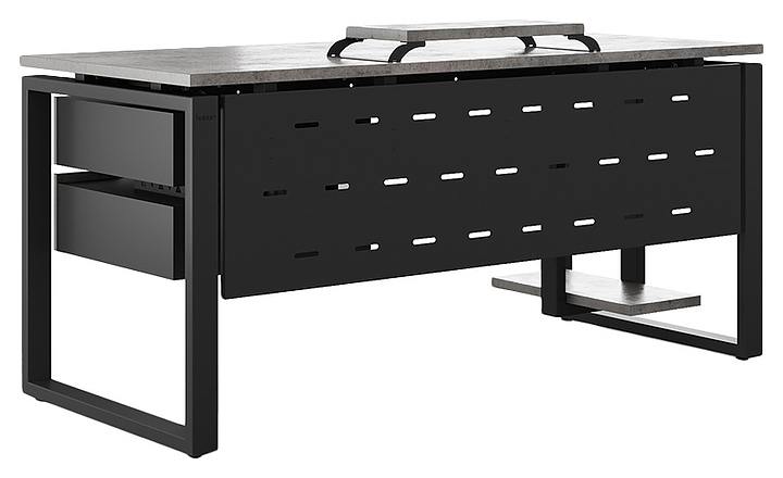 Офисный стол Кобор O1-160/80 black/chicago используется в офисных помещениях и кабинетах руководителей. Модель оснащена O-образными опорами. Каркас выполнен из металла, выкрашенного в цвет черный муар (RAL9005), столешница – из ламинированной древесно-стружечной плиты (ЛДСП) цвета бетон чикаго (F186 ST9). Опции (заказываются отдельно):