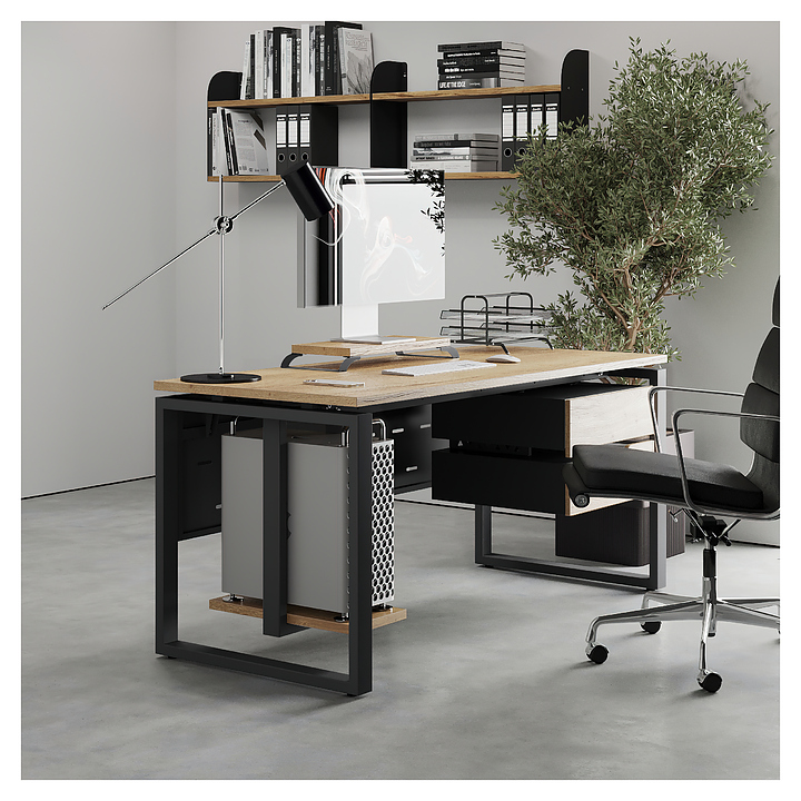 Офисный стол Кобор O1-180/70 black/natural используется в офисных помещениях и кабинетах руководителей. Модель оснащена O-образными опорами. Каркас выполнен из металла, выкрашенного в цвет черный муар (RAL9005), столешница – из ламинированной древесно-стружечной плиты (ЛДСП) цвета натуральный дуб (H1180 ST37). Опции (заказываются отдельно):