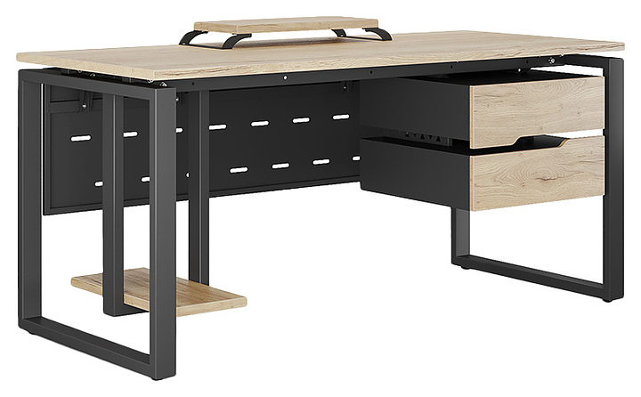 Офисный стол Кобор O1-120/80 black/natural используется в офисных помещениях и кабинетах руководителей. Модель оснащена O-образными опорами. Каркас выполнен из металла, выкрашенного в цвет черный муар (RAL9005), столешница – из ламинированной древесно-стружечной плиты (ЛДСП) цвета натуральный дуб (H1180 ST37). Опции (заказываются отдельно):