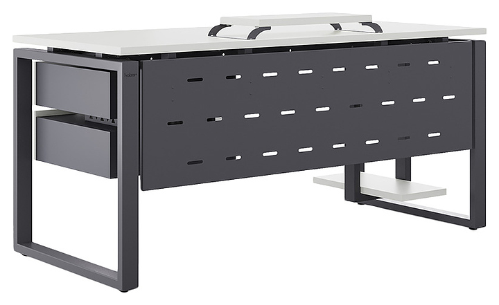 Офисный стол Кобор O1-120/60 graphite/premium используется в офисных помещениях и кабинетах руководителей. Модель оснащена O-образными опорами. Каркас выполнен из металла, выкрашенного в цвет графит муар (RAL7024), столешница – из ламинированной древесно-стружечной плиты (ЛДСП) цвета белый премиум (W1000 ST9). Опции (заказываются отдельно):