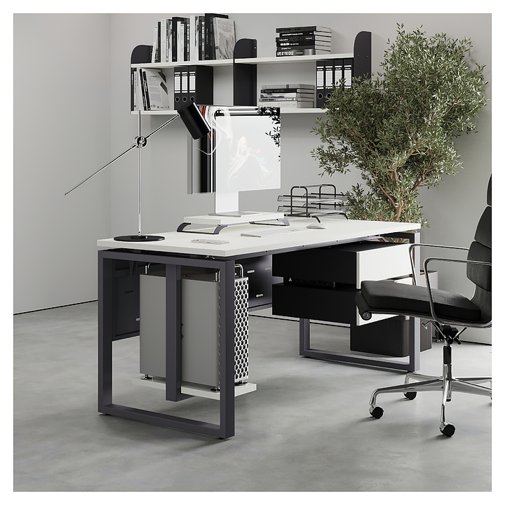 Офисный стол Кобор O1-180/60 graphite/premium используется в офисных помещениях и кабинетах руководителей. Модель оснащена O-образными опорами. Каркас выполнен из металла, выкрашенного в цвет графит муар (RAL7024), столешница – из ламинированной древесно-стружечной плиты (ЛДСП) цвета белый премиум (W1000 ST9). Опции (заказываются отдельно):