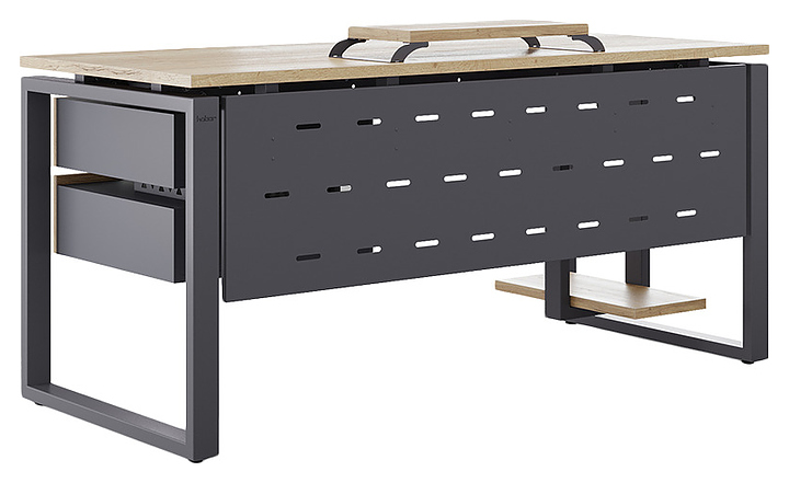 Офисный стол Кобор O1-140/70 graphite/natural используется в офисных помещениях и кабинетах руководителей. Модель оснащена O-образными опорами. Каркас выполнен из металла, выкрашенного в цвет графит муар (RAL7024), столешница – из ламинированной древесно-стружечной плиты (ЛДСП) цвета натуральный дуб (H1180 ST37). Опции (заказываются отдельно):
