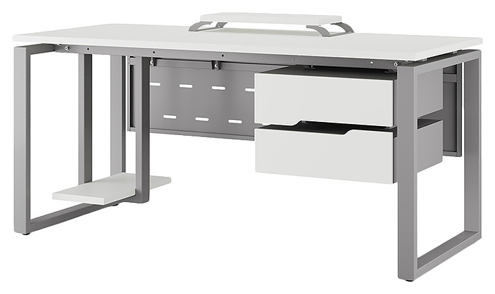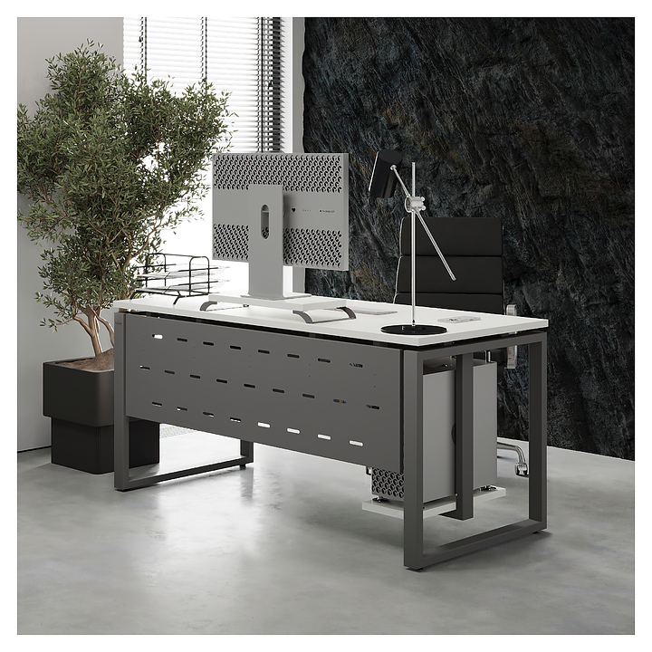 Офисный стол Кобор O1-80/80 aluminum/premium используется в офисных помещениях и кабинетах руководителей. Модель оснащена O-образными опорами. Каркас выполнен из металла, выкрашенного в цвет алюминиевый металлик (RAL9006), столешница – из ламинированной древесно-стружечной плиты (ЛДСП) цвета белый премиум (W1000 ST9). Опции (заказываются отдельно):