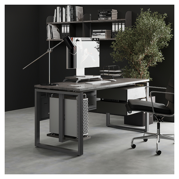 Офисный стол Кобор O1-160/60 aluminum/chicago используется в офисных помещениях и кабинетах руководителей. Модель оснащена O-образными опорами. Каркас выполнен из металла, выкрашенного в цвет алюминиевый металлик (RAL9006), столешница – из ламинированной древесно-стружечной плиты (ЛДСП) цвета бетон чикаго (F186 ST9). Опции (заказываются отдельно):