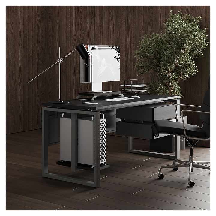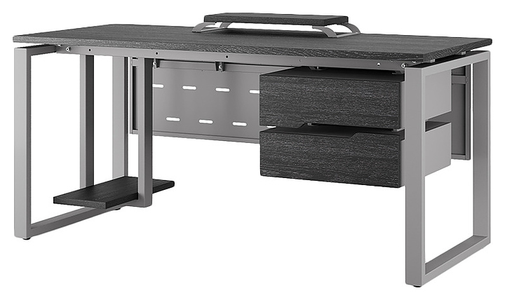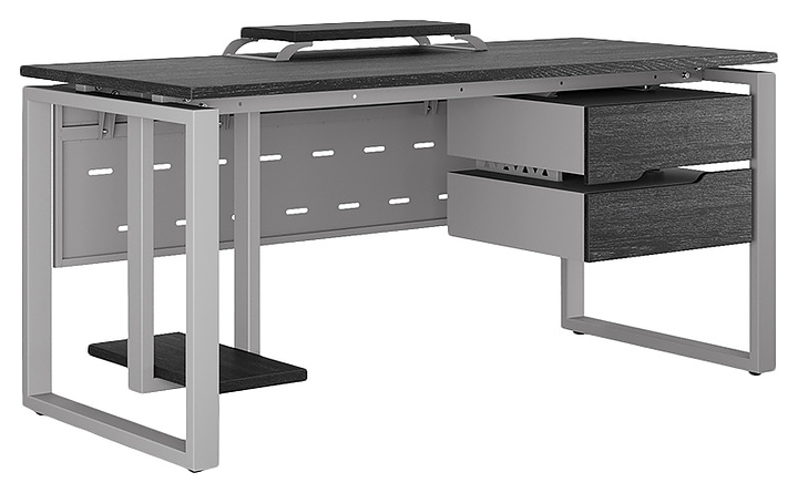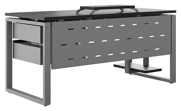 Офисный стол Кобор O1-140/60 aluminum/glazed используется в офисных помещениях и кабинетах руководителей. Модель оснащена O-образными опорами. Каркас выполнен из металла, выкрашенного в цвет алюминиевый металлик (RAL9006), столешница – из ламинированной древесно-стружечной плиты (ЛДСП) цвета черный дуб (H3178 ST37). Опции (заказываются отдельно):